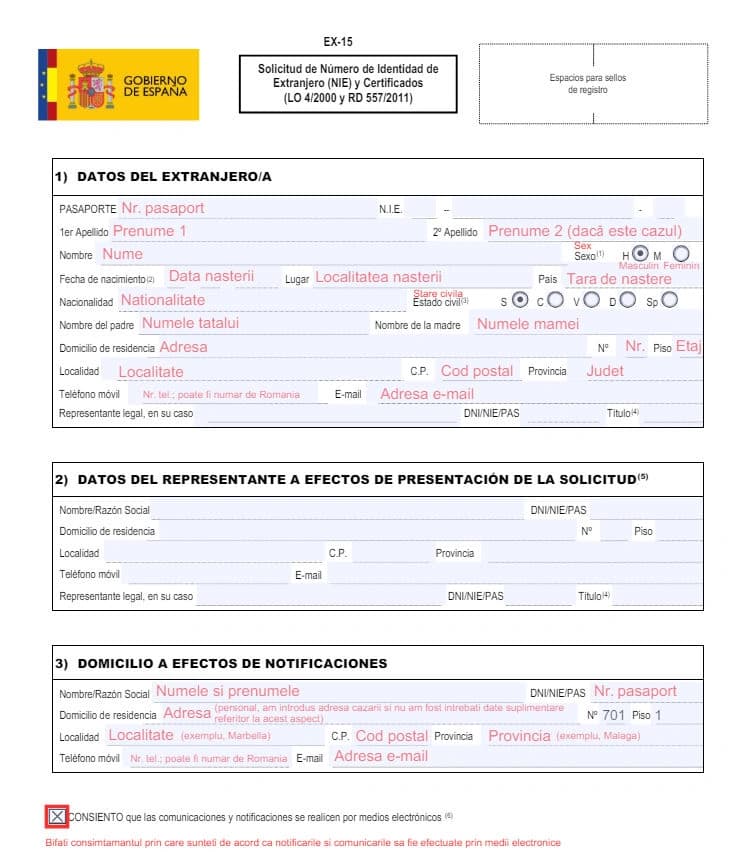 Accesând această pagină Formularul EX-15 veți regăsi un formular PDF în format editabil unde trebuie introduse anumite date. După completarea datelor, acest fișier PDF, Formularul EX-15, trebuie descărcat pe computerul dvs., listat și prezentat în ziua programării la oficiul de eliberare a numărului NIE.