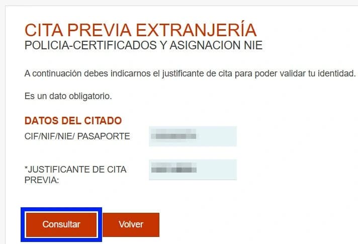 Introduceți nr. pașaportului dvs. în dreptul câmpului "CIF/NIF/NIE/PASAPORTE" și numărul unic de identificare a programării ("Nr. de Justificante de cita" din confirmarea programării) și apoi dați click pe "Consultar":