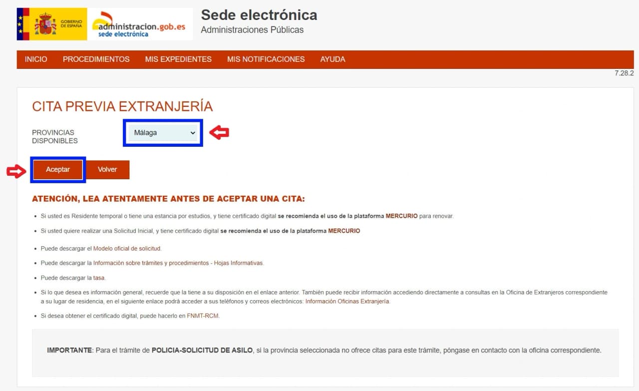 Selectați provincia spaniolă în care doriți să vă programați (în exemplu, am selectat "Málaga") și dați click pe butonul "Aceptar":