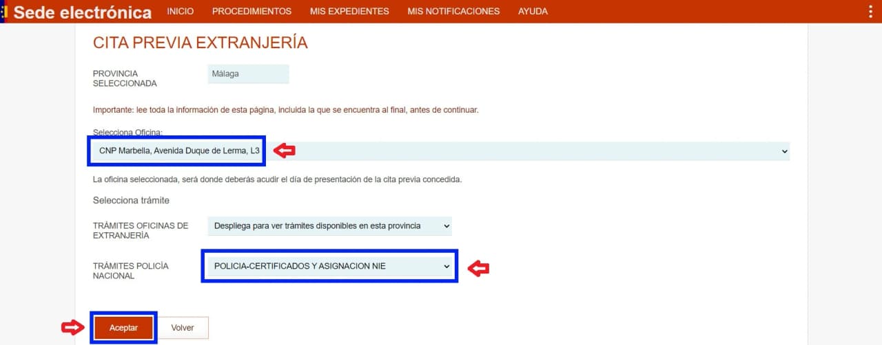 Selectați oficiul la care doriți să vă prezentați (în exemplu, este selectat un oficiu din Marbella) sau selectați opțiunea "Cualquier oficina" în cazul în care nu aveți o anumită preferință sau dacă doriți să consultați care dintre oficii vă sunt recomandate. De asemenea, selectați opțiunea "POLICIA-CERTIFICADOS Y ASIGNACION NIE" care marchează tipul de serviciu de care doriți să beneficiați, și anume de obținerea numărului NIE. Dați click pe butonul "Aceptar":