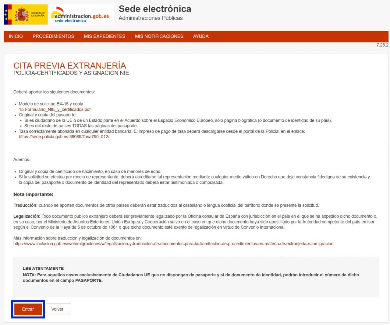 Formularul 790-12, completat (consultați secțiunea Modalitatea de completare a formularului 790-12 pentru a vedea cum se completează acesta) pentru a efectua plata taxei corespunzătoare (9,84 euro în 2024). Această taxă se poate achita în orice bancă spaniolă, sau la unele ATM-uri și este nevoie să aveți la dvs. în momentul efectuării plății Formularul 790-12 completat, deoarece se va scana un cod de bare prezent pe acesta (video-ul ce urmează explică pașii ce trebuie efectuați).