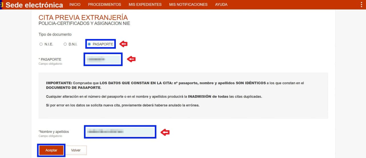 Selectați opțiunea "PASAPORTE" (pașaport) și introduceți numărul pașaportului dvs. De asemenea, în dreptul câmpului "Nombre y apellidos" introduceți numele și prenumele dvs. Ulterior, dați click pe "Aceptar":
