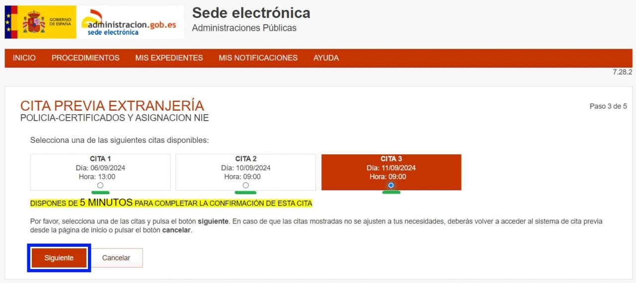 Vi se vor pune la dispoziție una sau mai multe variante ("CITA") din care dvs. veți putea alege (în exemplu, sunt 3 variante: 3 zile diferite, la ore diverse). Alegeți varianta care vă este pe plac și dați click pe "Siguiente":