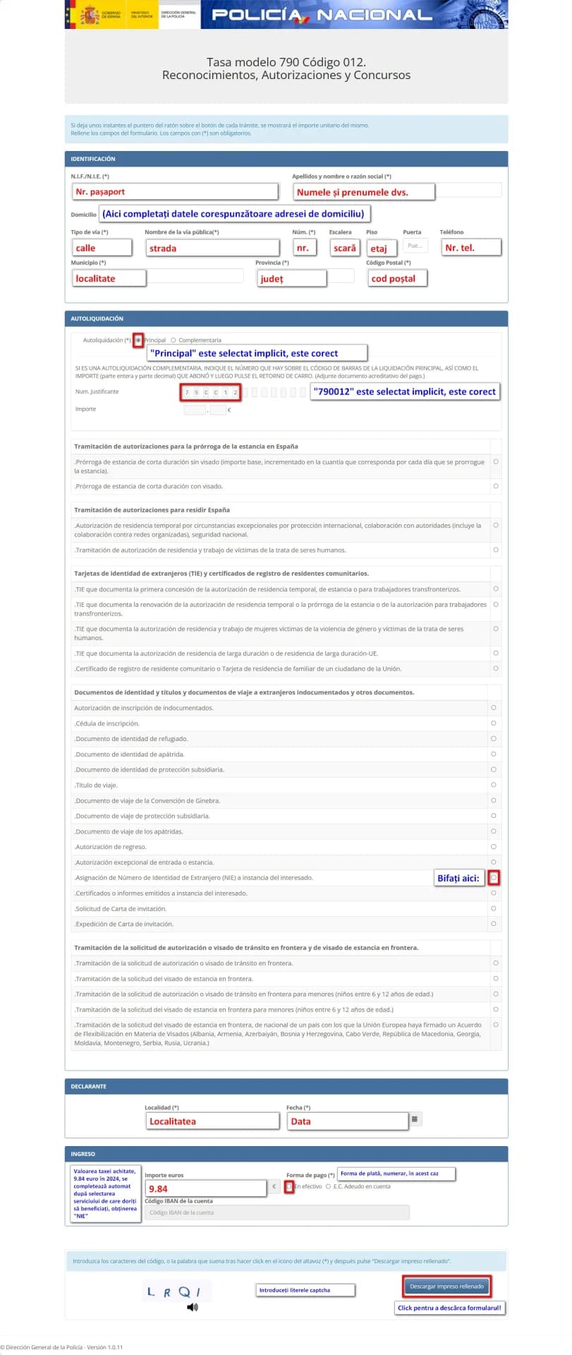 Accesând această pagină Formularul 790-12 veți regăsi un formular unde trebuie introduse anumite date. După completarea acestor date, site-ul va crea automat un fișier PDF. Acest fișier PDF, Formularul 790-12, trebuie descărcat pe computerul dvs., listat și prezentat în ziua programării la oficiul de eliberare a numărului NIE.