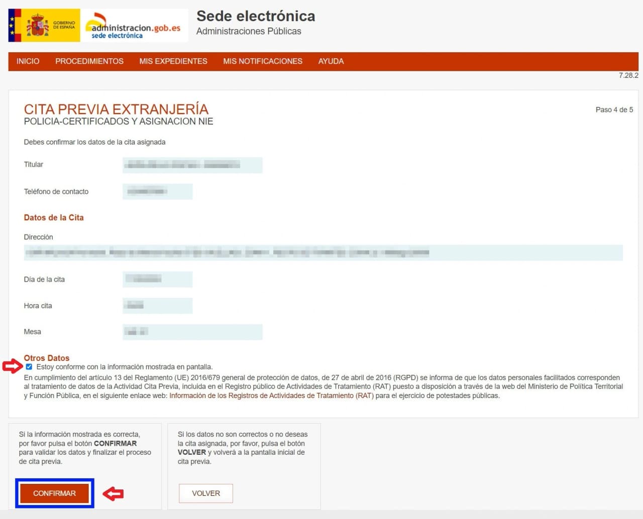 Verificați datele introduse, bifați opțiunea "Estoy conforme con la informacion mostrada en pantalla." din secțiunea "Otros Datos" și dați click pe "CONFIRMAR":