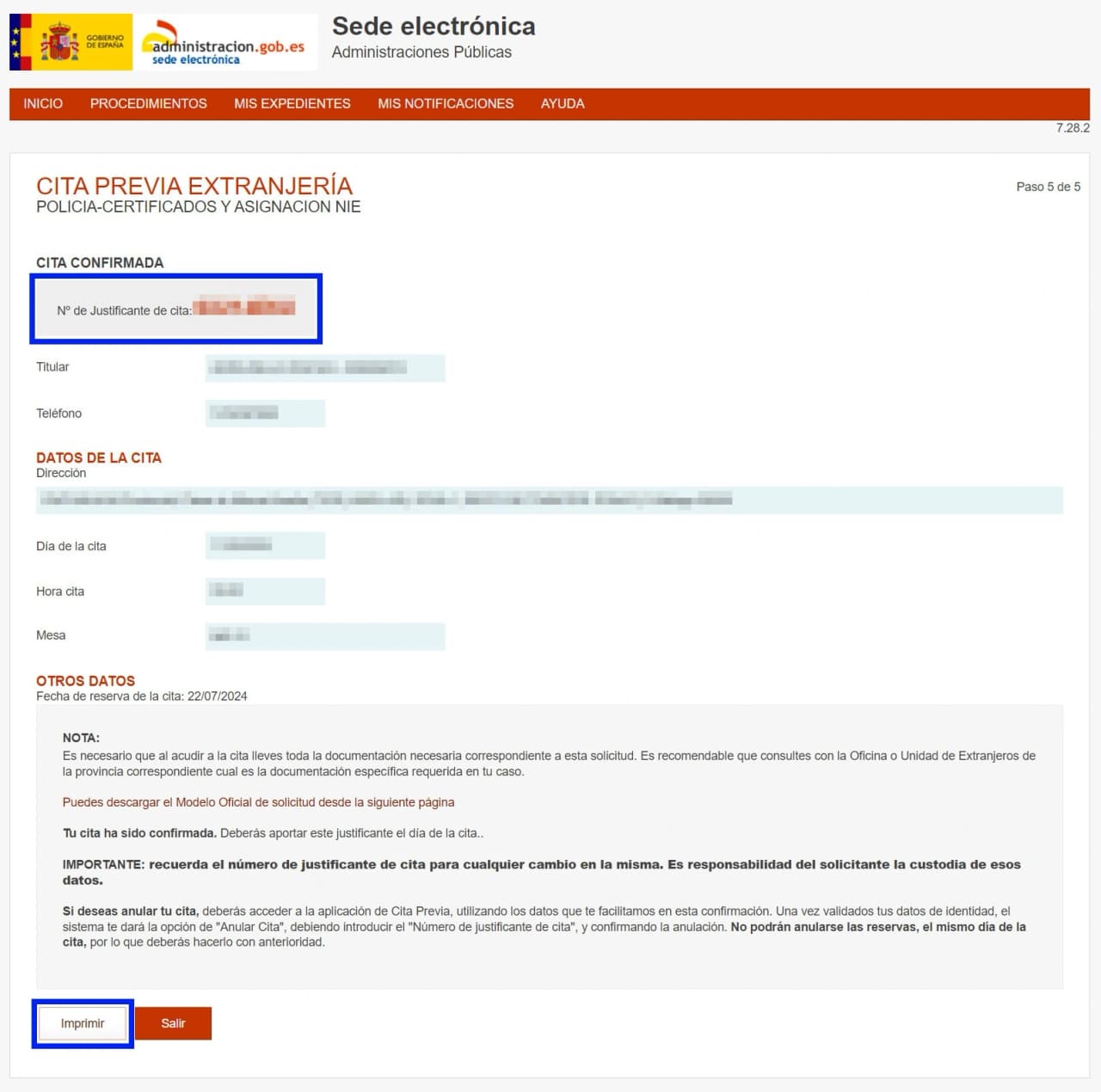 Solicitarea dvs. de programare pentru obținerea numărului a fost efectuată cu succes dacă este afișat mesajul "CITA CONFIRMADA". Păstrați numărul unic de identificare a programării din dreptul câmpului "Nr. de Justificante de cita" sau printați datele corespunzătoare programării dând click pe butonul "Imprimir":